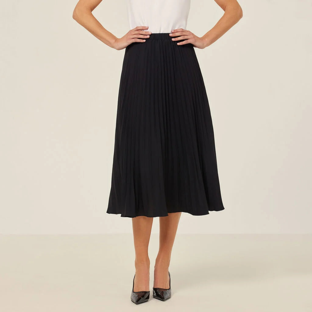 The Georgie Midi Pleated Skirt fuses style with comfort. Striking sunray pleats of lightweight georgette cascade from a comfortable elasticised waistband to an elegant calf-length hemline. The relaxed shape is lined to the knee for extra coverage, while the bottom of the skirt remains sheer for a soft effect. It has been mindfully crafted using recycled polyester yarn that’s wrinkle resistant and quick drying, ideal for busy schedules. Wear with a structured blouse that will balance out your look.