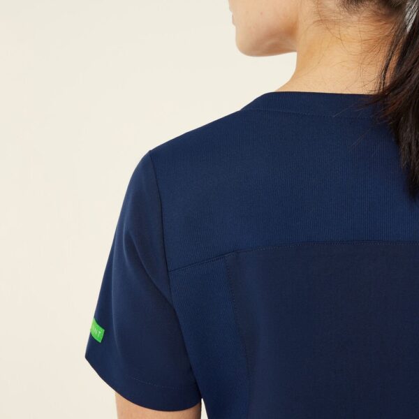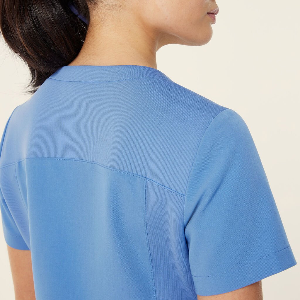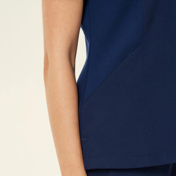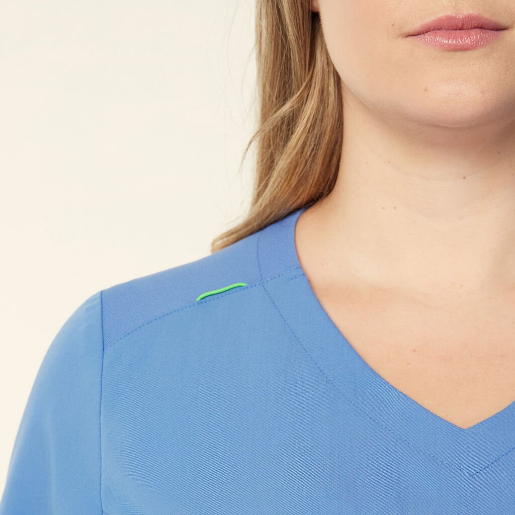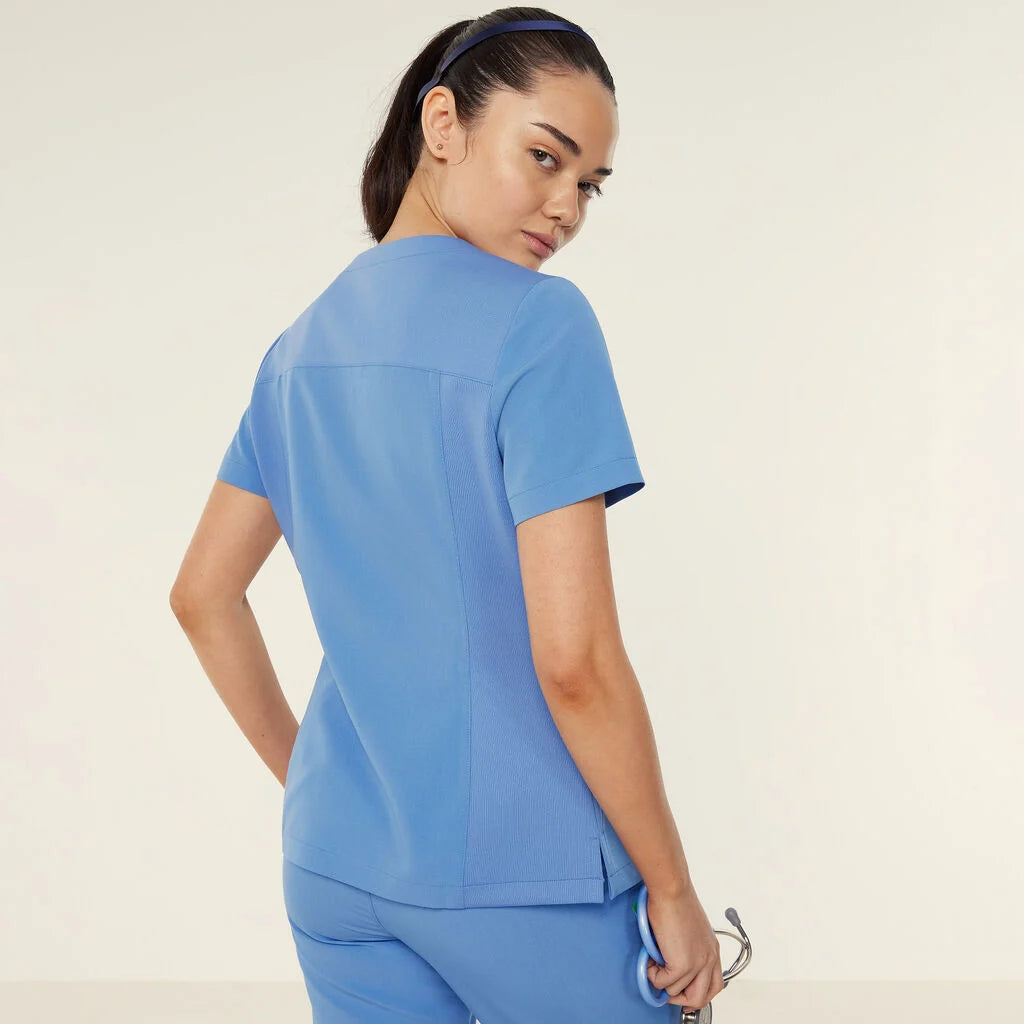 The Helen Scrub Top features a sleek slim fit, designed for both style and comfort. The V-neck pull-on style offers effortless wear, while the short sleeves and mid-length cut provide a flattering, functional fit. Equipped with two hip pockets for convenient storage, this top also features contrast key loops at the shoulder and pocket for a modern touch. Side splits at the hem enhance mobility, and the high-stretch rib fabric with side panels ensures extra comfort and flexibility, perfect for all-day wear.