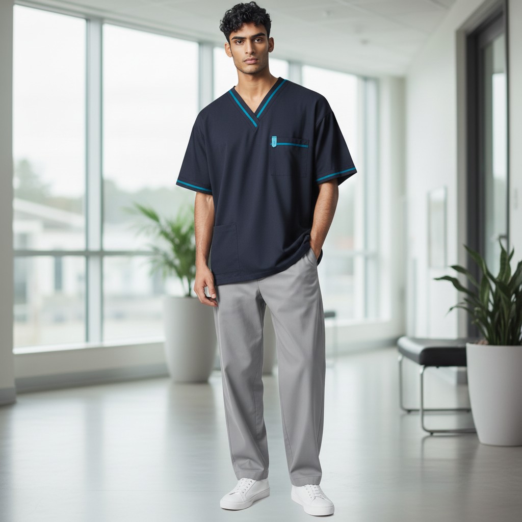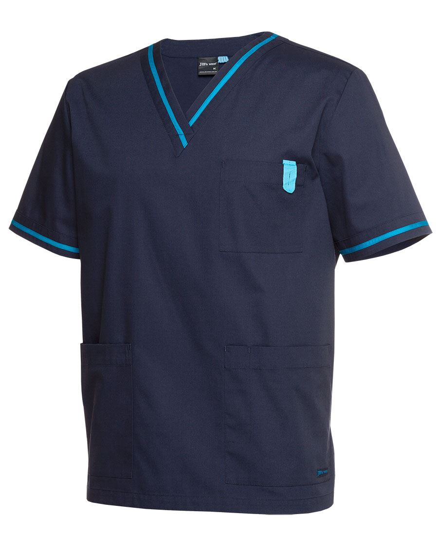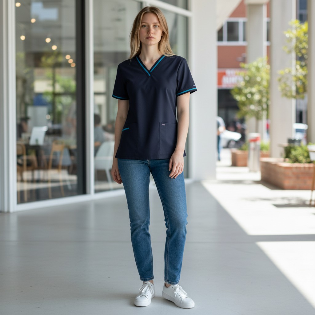 - V-neck top, set in sleeves, side vents, size identification colour loop sewn next to main label