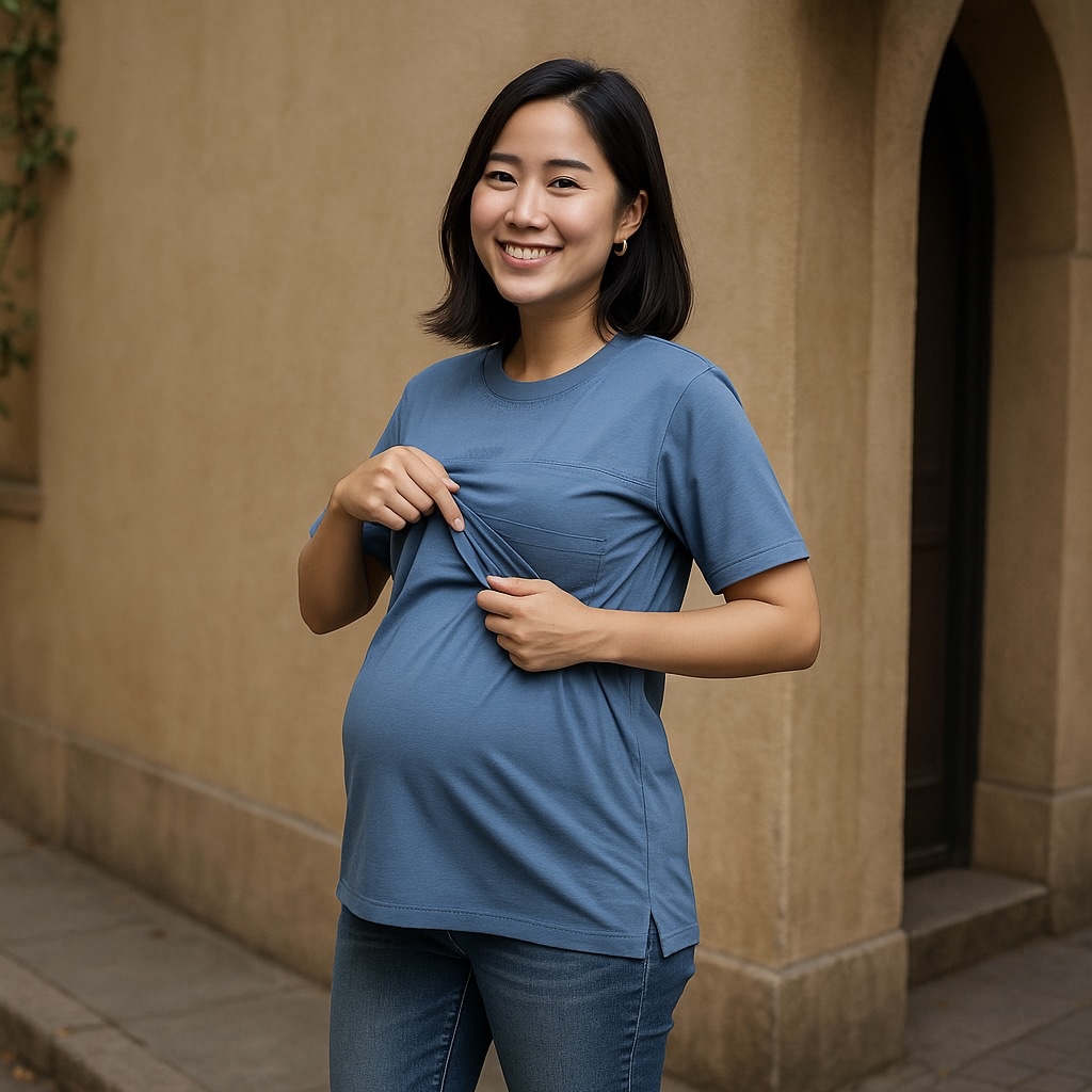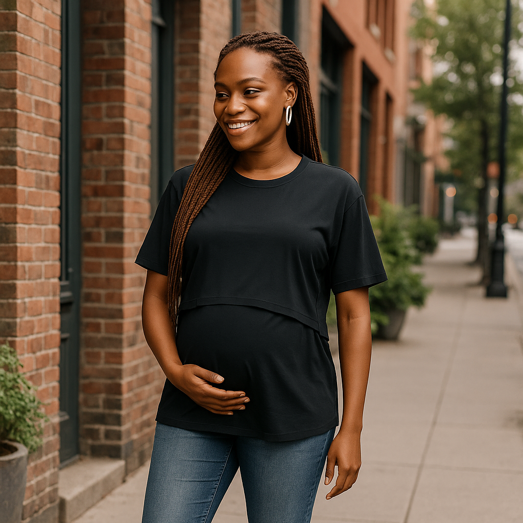Featuring a classic round neckline, short sleeves, and a discreet nursing-friendly opening, this top offers easy access for breastfeeding without compromising style. The soft stretch fabric adapts to your changing body, while the relaxed fit ensures freedom of movement and all-day comfort. Whether you’re lounging, working, or on the go, this top supports your lifestyle with grace.