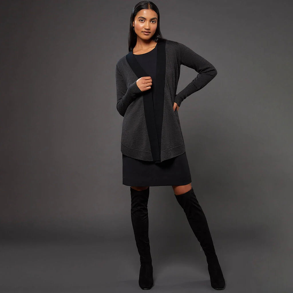 With its modern, effortless design and 100% pure Merino wool fabrication, the Longline Jacket is a smart investment. The oversized proportions work perfectly when styled with slim tailoring, while the luxurious natural fibres deliver softness and warmth. Designed without fastenings or fuss, this statement piece takes a minimalist approach to knitwear. Its contemporary charcoal colourway with contrasting trim adds interest to an otherwise simple silhouette. We love the extended, fitted cuffs, which deliver a hint of structure – wear them long or push up the sleeves for a relaxed look.