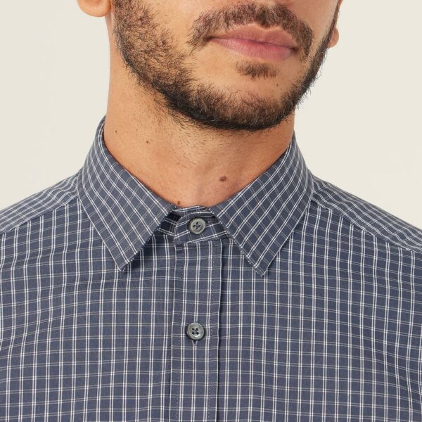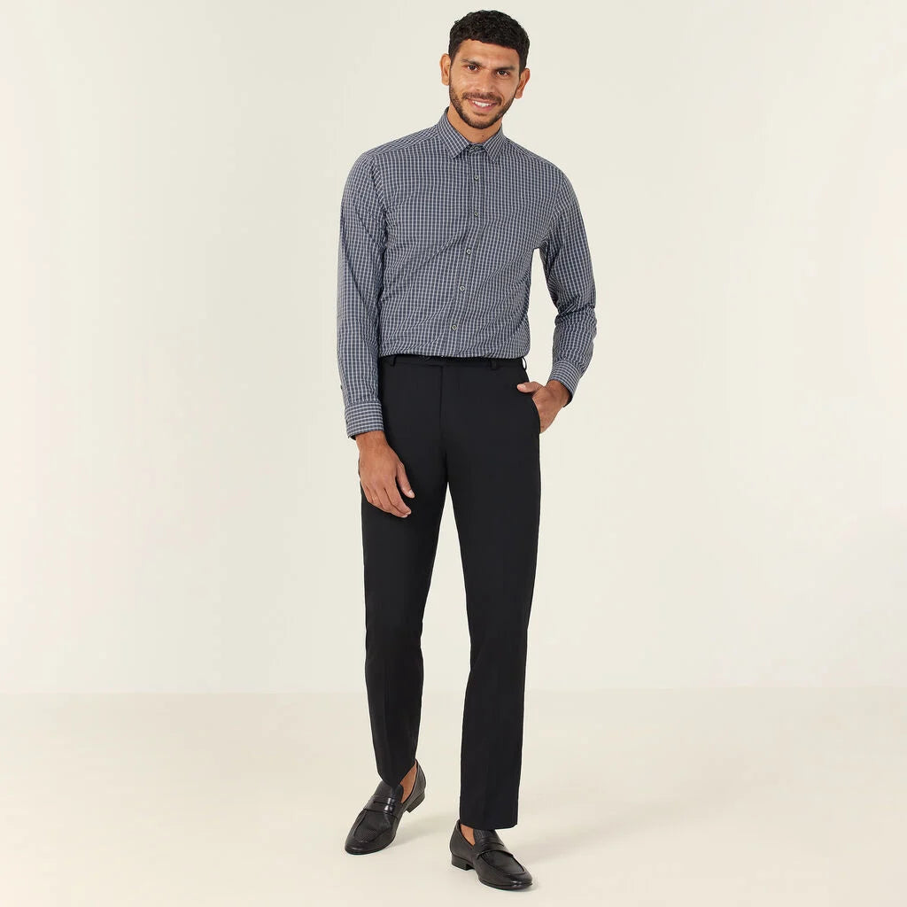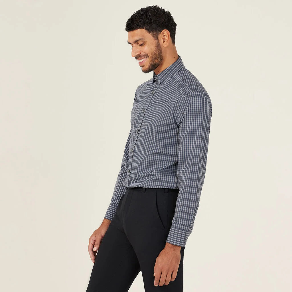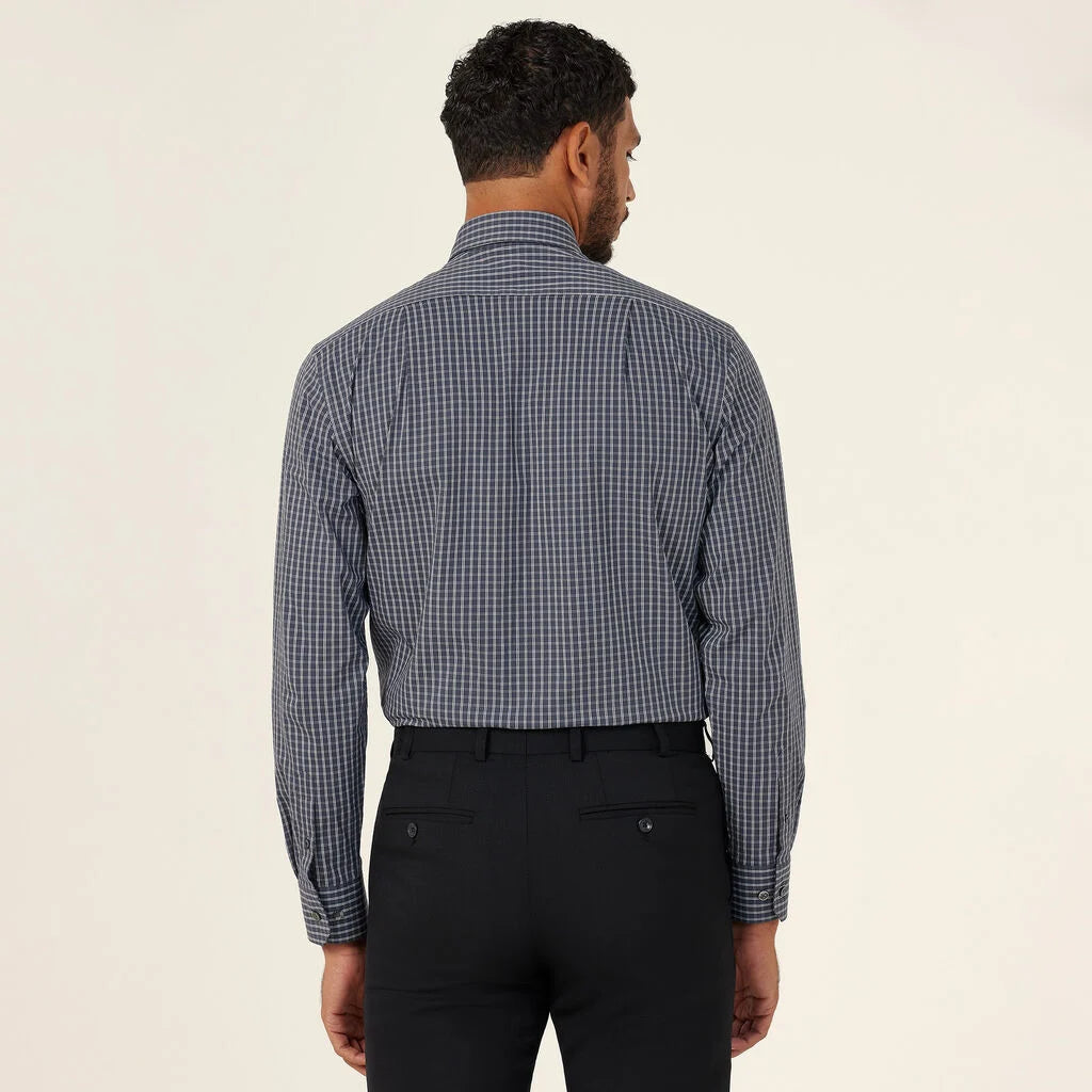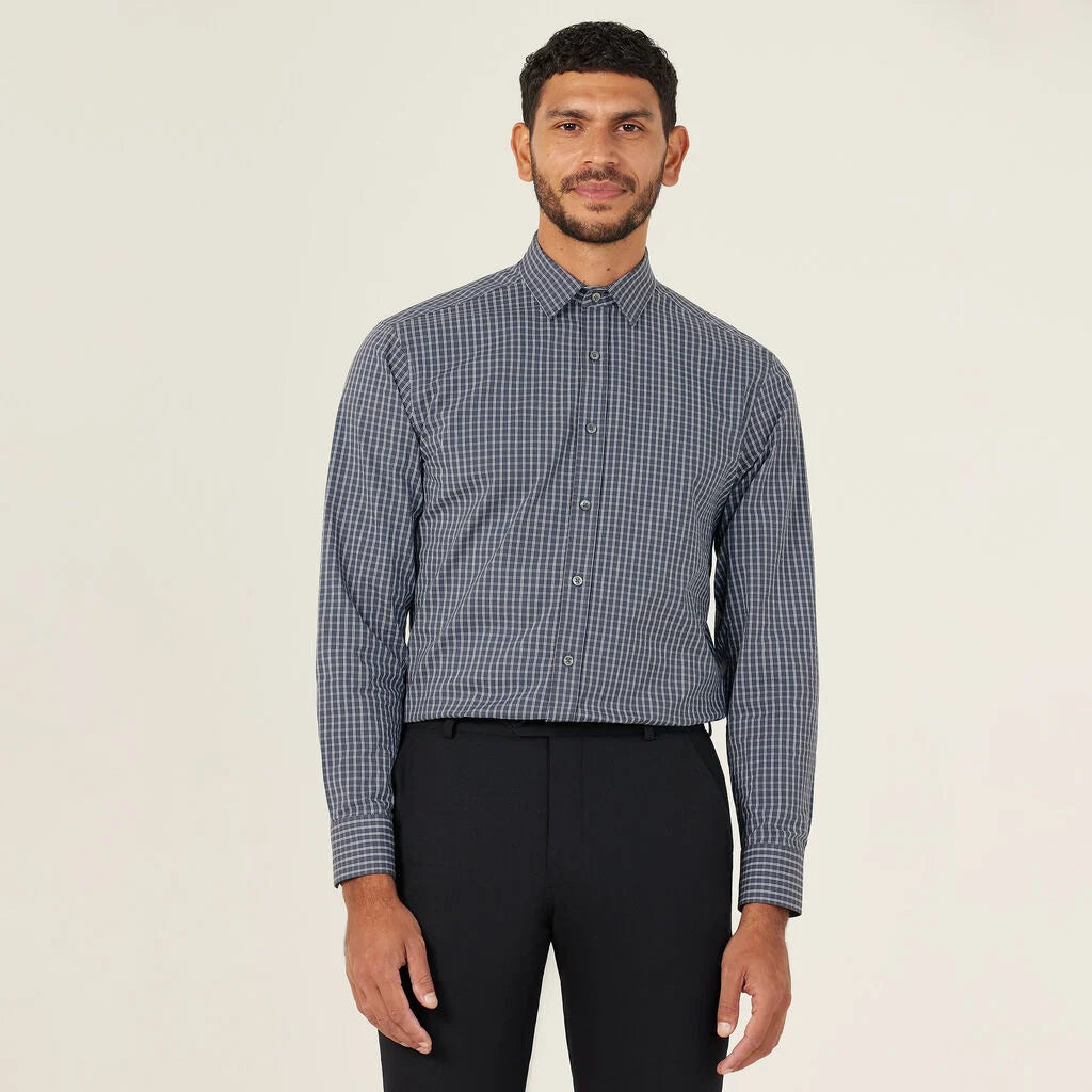 Think a sharp collared neckline with permanent collar stays, long sleeves with adjustable cuffs, back pleats for room to move and a comfortable regular fit. And now, the Avignon Fine Check Long Sleeve Shirt offers a fresh take in a cool navy colourway spliced with sharp white checks. The design is stamped across a new durable yet breathable fabric, which forms part of our Good Thread range. It has been mindfully made using recycled polyester, combined with luxurious cotton and elastane for stretch. Team with chinos for a more relaxed spin on tailoring.